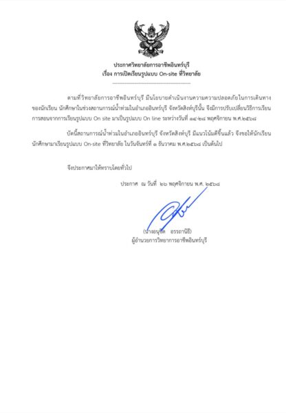 ประกาศวิทยาลัยการอาชีพอินทร์บุรี เรื่อง การเปิดเรียนรูปแบบ On-site ที่วิทยาลัยตามที่วิทยาลัยการอาชีพอินทร์บุรี มีนโยบายดำเนินงานความความปลอดภัยในการเดินทาง ของนักเรียน นักศึกษาในช่วงสถานการณ์น้ำท่วมในอำเภออินทร์บรี จังหวัดสิงห์บุรีนั้น จึงมีการปรับเปลี่ยนวิธีการเรียน การสอนจากการเรียนรูปแบบ On site มาเป็นรูปแบบ On line ระหว่างวันที่ 14-28 พฤศจิกายน พ.ศ. 2568 บัดนี้สถานการณ์นำท่วมในอำเภออินทร์บุรี จังหวัดสิงห์บุรี มีแนวโน้มดีขึ้นแล้ว จึงขอให้นักเรียนนักศึกษามาเรียนรูปแบบ On-site ที่วิทยาลัย ในวันจันทร์ที่ 1 ธันวาคม พ.ศ. 2568 เป็นต้นไป จึงประกาศมาให้ทราบโดยทั่วไป ประกาศ ณ วันที่ 26 พฤศจิกายน พ.ศ. 2568