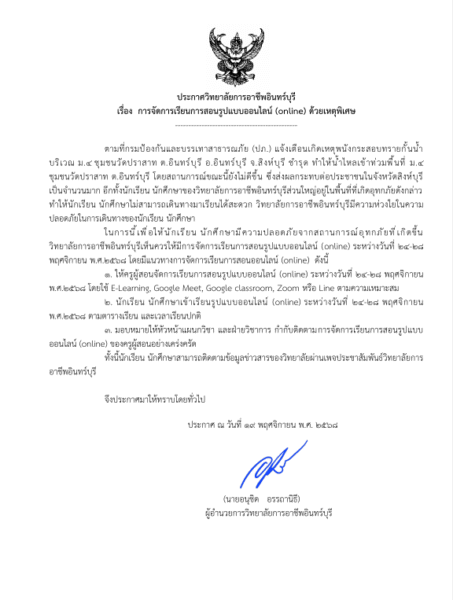 จากสถานการณ์น้ำท่วมในจังหวัดสิงห์บุรี ส่งผลกระทบต่อประชาชน และนักเรียน นักศึกษาของวิทยาลัยการอาชีพอินทร์บุรีส่วนใหญ่อยู่ในพื้นที่ที่เกิดอุทภภัยดังกล่าว ทำให้นักเรียน นักศึกษาไม่สามารถเดินทางมาเรียนได้สะดวก วิทยาลัยการอาชีพอินทร์บุรีมีความห่วงใยในความปลอดภัยในการเดินทางของนักเรียน นักศึกษา ในการนี้เพื่อให้นักเรียน นักศึกษามีความปลอดภัยจากสถานการณ์อุทกภัยที่เกิดขึ้ดขึ้น วิทยาลัยการอาชีพอินทร์บุรีเห็นควรปรับรูปแบบการสอนจัดการเรียนการสอน